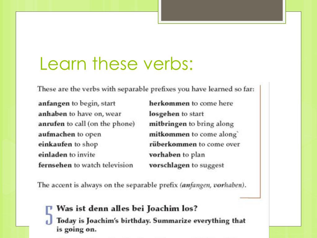 Hausaufgaben • HA: Vokabeln lernen for quiz on Tuesday (separable prefix verbs) • Lernensie die neuenVokabeln (study new vocabulary list: ersteListe on Quizlet) • Finish Handout: Regular Verbs: Pages 1 and 2 • Finish handouts: haben/ werden / and separable verbs