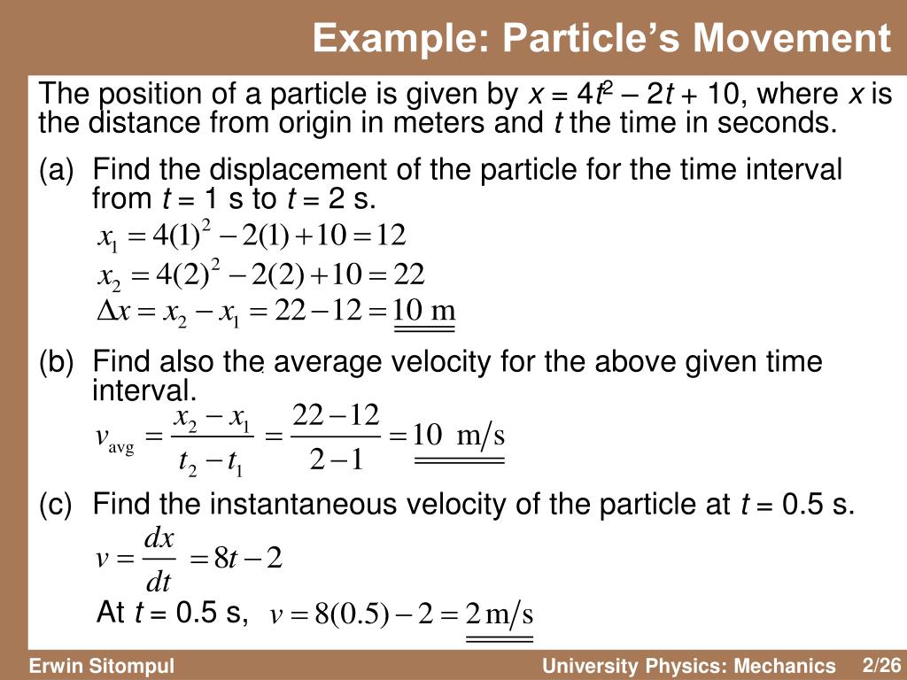 Example: Particle’s Movement The position of a particle is given by x = 4t2 – 2t + 10, where x is the distance from origin in meters and t the time in seconds. (a) Find the displacement of the particle for the time interval from t = 1 s to t = 2 s. (b) Find also the average velocity for the above given time interval. . (c) Find the instantaneous velocity of the particle at t = 0.5 s. At t = 0.5 s,