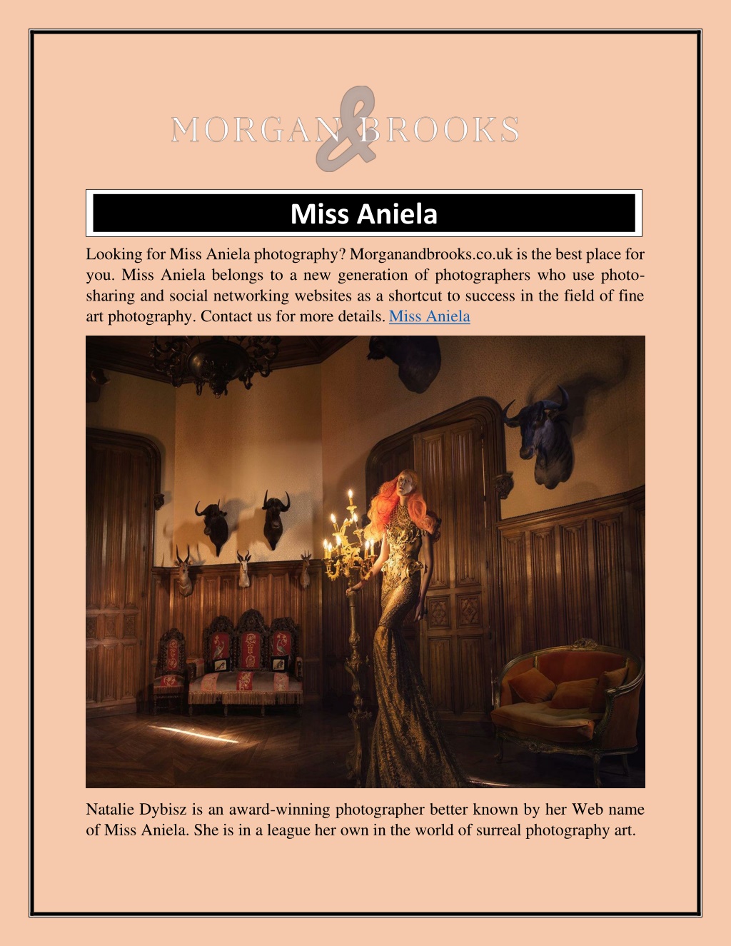 Miss Aniela Looking for Miss Aniela photography? Morganandbrooks.co.uk is the best place for you. Miss Aniela belongs to a new generation of photographers who use photo- sharing and social networking websites as a shortcut to success in the field of fine art photography. Contact us for more details.Miss Aniela Natalie Dybisz is an award-winning photographer better known by her Web name of Miss Aniela. She is in a league her own in the world of surreal photography art.