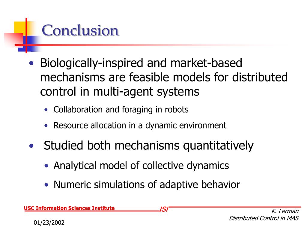 Conclusion • Biologically-inspired and market-based mechanisms are feasible models for distributed control in multi-agent systems • Collaboration and foraging in robots • Resource allocation in a dynamic environment • Studied both mechanisms quantitatively • Analytical model of collective dynamics • Numeric simulations of adaptive behavior