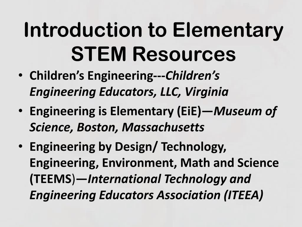 Introduction to ElementarySTEM Resources • Children’s Engineering---Children’s Engineering Educators, LLC, Virginia • Engineering is Elementary (EiE)—Museum of Science, Boston, Massachusetts • Engineering by Design/ Technology, Engineering, Environment, Math and Science (TEEMS)—International Technology and Engineering Educators Association (ITEEA)