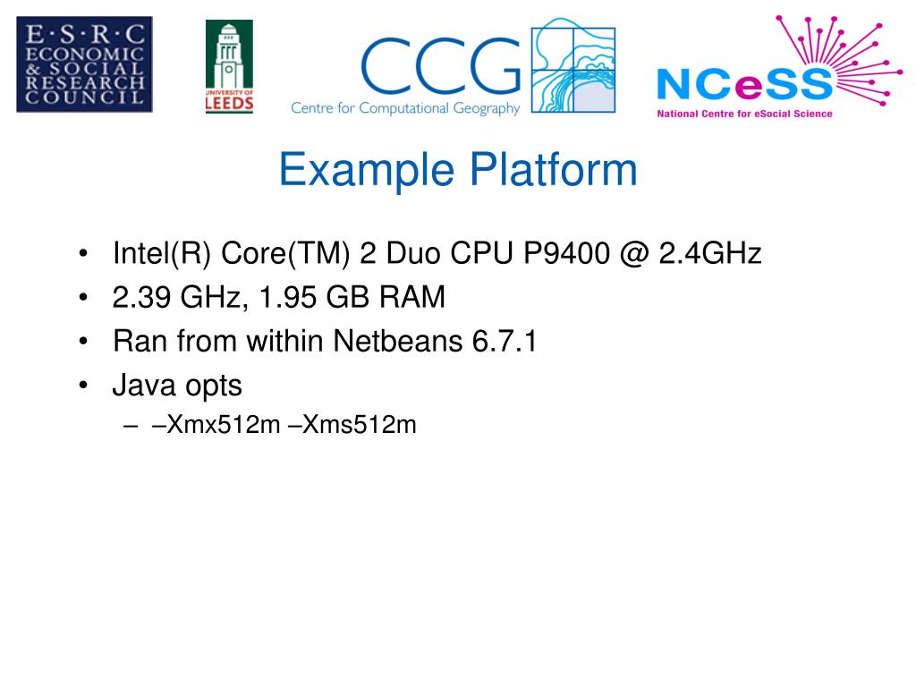 Example Platform • Intel(R) Core(TM) 2 Duo CPU P9400 @ 2.4GHz • 2.39 GHz, 1.95 GB RAM • Ran from within Netbeans 6.7.1 • Java opts • –Xmx512m –Xms512m