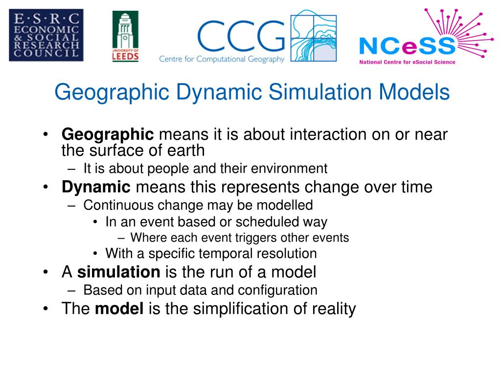 Geographic Dynamic Simulation Models • Geographic means it is about interaction on or near the surface of earth • It is about people and their environment • Dynamic means this represents change over time • Continuous change may be modelled • In an event based or scheduled way • Where each event triggers other events • With a specific temporal resolution • A simulation is the run of a model • Based on input data and configuration • The model is the simplification of reality