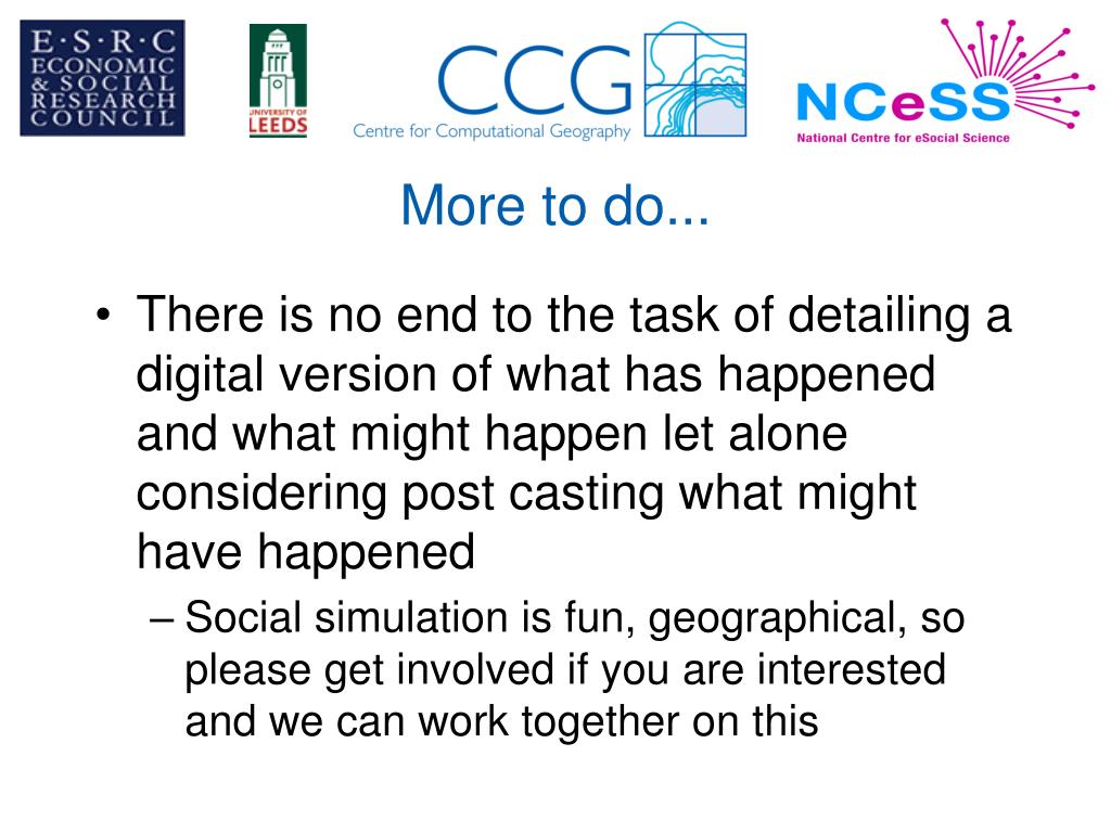 More to do... • There is no end to the task of detailing a digital version of what has happened and what might happen let alone considering post casting what might have happened • Social simulation is fun, geographical, so please get involved if you are interested and we can work together on this