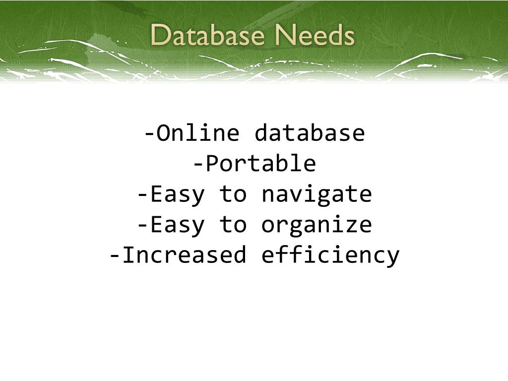 Database Needs -Online database -Portable -Easy to navigate -Easy to organize -Increased efficiency