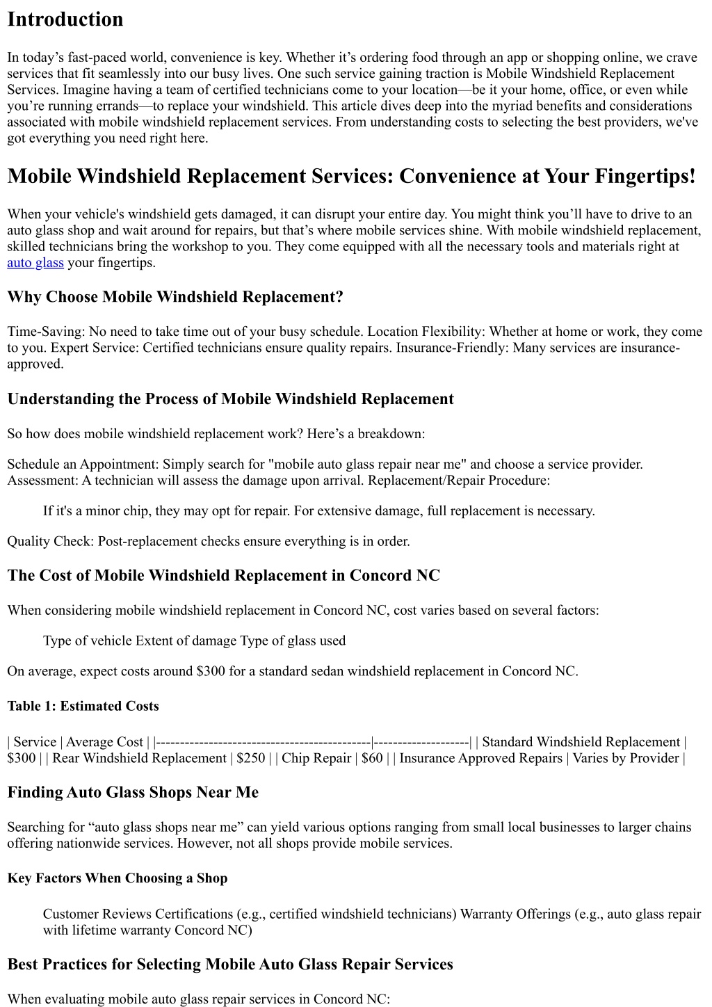 Introduction In today’s fast-paced world, convenience is key. Whether it’s ordering food through an app or shopping online, we crave services that fit seamlessly into our busy lives. One such service gaining traction is Mobile Windshield Replacement Services. Imagine having a team of certified technicians come to your location—be it your home, office, or even while you’re running errands—to replace your windshield. This article dives deep into the myriad benefits and considerations associated with mobile windshield replacement services. From understanding costs to selecting the best providers, we've got everything you need right here. Mobile Windshield Replacement Services: Convenience at Your Fingertips! When your vehicle's windshield gets damaged, it can disrupt your entire day. You might think you’ll have to drive to an auto glass shop and wait around for repairs, but that’s where mobile services shine. With mobile windshield replacement, skilled technicians bring the workshop to you. They come equipped with all the necessary tools and materials right at auto glass your fingertips. Why Choose Mobile Windshield Replacement? Time-Saving: No need to take time out of your busy schedule. Location Flexibility: Whether at home or work, they come to you. Expert Service: Certified technicians ensure quality repairs. Insurance-Friendly: Many services are insurance- approved. Understanding the Process of Mobile Windshield Replacement So how does mobile windshield replacement work? Here’s a breakdown: Schedule an Appointment: Simply search for "mobile auto glass repair near me" and choose a service provider. Assessment: A technician will assess the damage upon arrival. Replacement/Repair Procedure: If it's a minor chip, they may opt for repair. For extensive damage, full replacement is necessary. Quality Check: Post-replacement checks ensure everything is in order. The Cost of Mobile Windshield Replacement in Concord NC When considering mobile windshield replacement in Concord NC, cost varies based on several factors: Type of vehicle Extent of damage Type of glass used On average, expect costs around $300 for a standard sedan windshield replacement in Concord NC. Table 1: Estimated Costs | Service | Average Cost | |---------------------------------------------|--------------------| | Standard Windshield Replacement | $300 | | Rear Windshield Replacement | $250 | | Chip Repair | $60 | | Insurance Approved Repairs | Varies by Provider | Finding Auto Glass Shops Near Me Searching for “auto glass shops near me” can yield various options ranging from small local businesses to larger chains offering nationwide services. However, not all shops provide mobile services. Key Factors When Choosing a Shop Customer Reviews Certifications (e.g., certified windshield technicians) Warranty Offerings (e.g., auto glass repair with lifetime warranty Concord NC) Best Practices for Selecting Mobile Auto Glass Repair Services When evaluating mobile auto glass repair services in Concord NC: