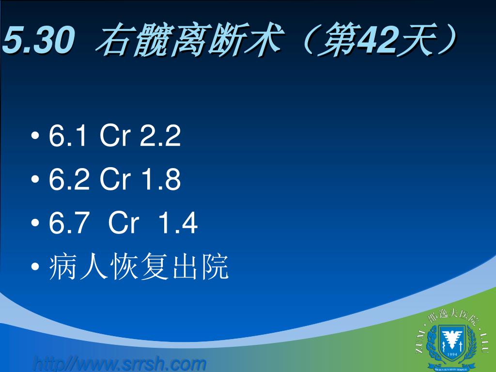 5.30 右髋离断术(第42天) • 6.1 Cr 2.2 • 6.2 Cr 1.8 • 6.7 Cr 1.4 • 病人恢复出院
