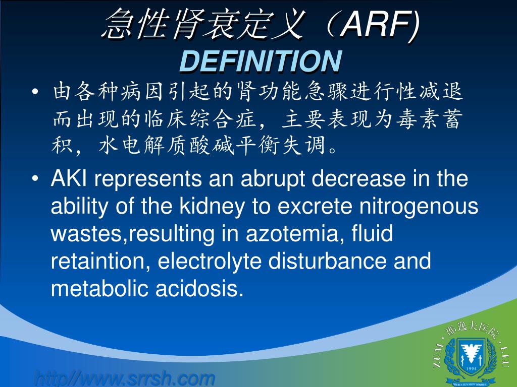 急性肾衰定义(ARF)DEFINITION • 由各种病因引起的肾功能急骤进行性减退而出现的临床综合症,主要表现为毒素蓄积,水电解质酸碱平衡失调。 • AKI represents an abrupt decrease in the ability of the kidney to excrete nitrogenous wastes,resulting in azotemia, fluid retaintion, electrolyte disturbance and metabolic acidosis.
