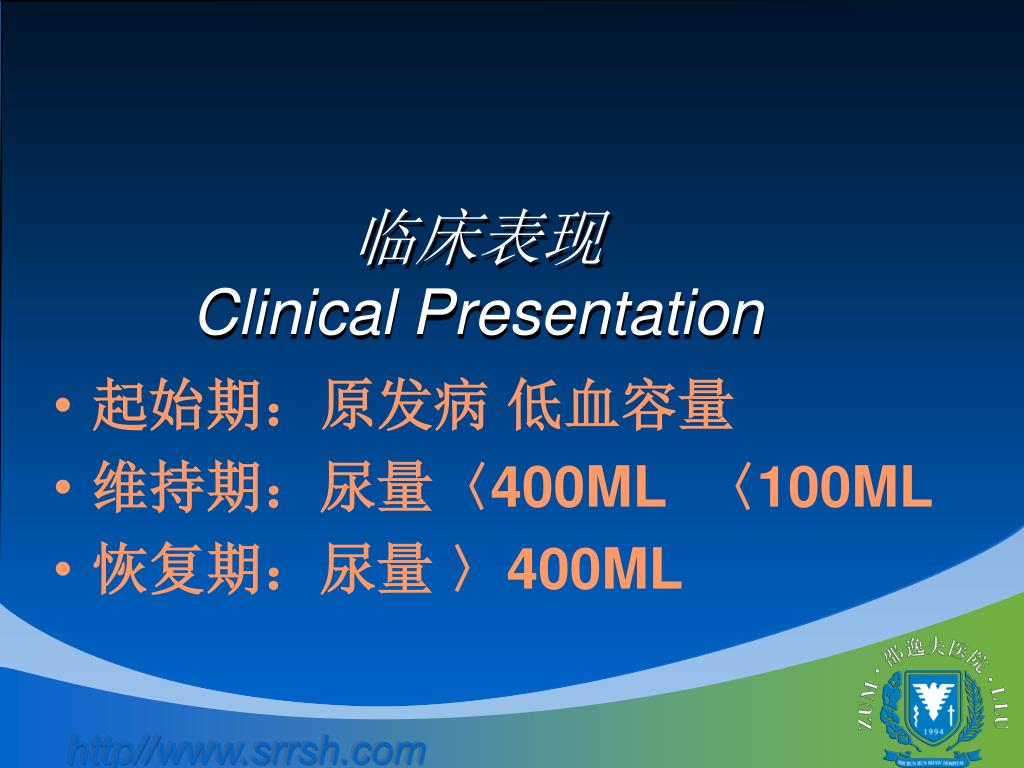 临床表现Clinical Presentation • 起始期:原发病 低血容量 • 维持期:尿量〈400ML 〈100ML • 恢复期:尿量 〉400ML