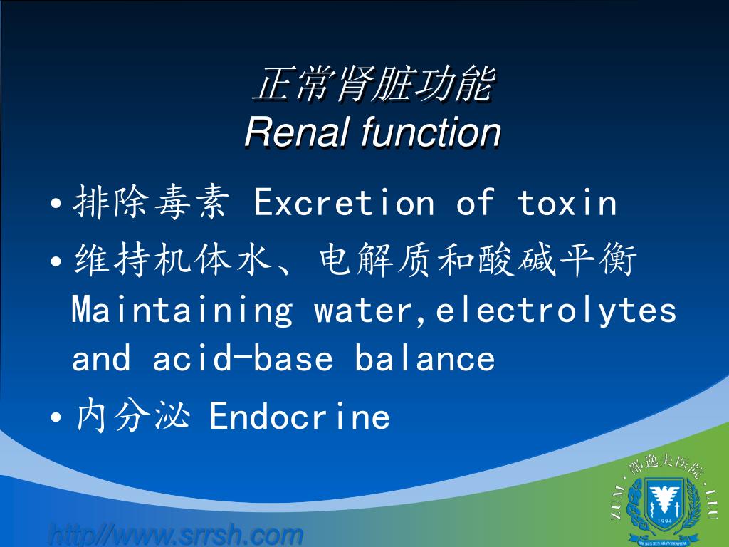 正常肾脏功能Renal function • 排除毒素 Excretion of toxin • 维持机体水、电解质和酸碱平衡 Maintaining water,electrolytes and acid-base balance • 内分泌Endocrine