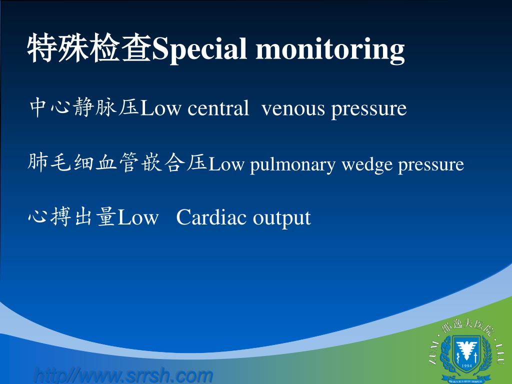 特殊检查Special monitoring 中心静脉压Low central venous pressure 肺毛细血管嵌合压Low pulmonary wedge pressure 心搏出量Low Cardiac output