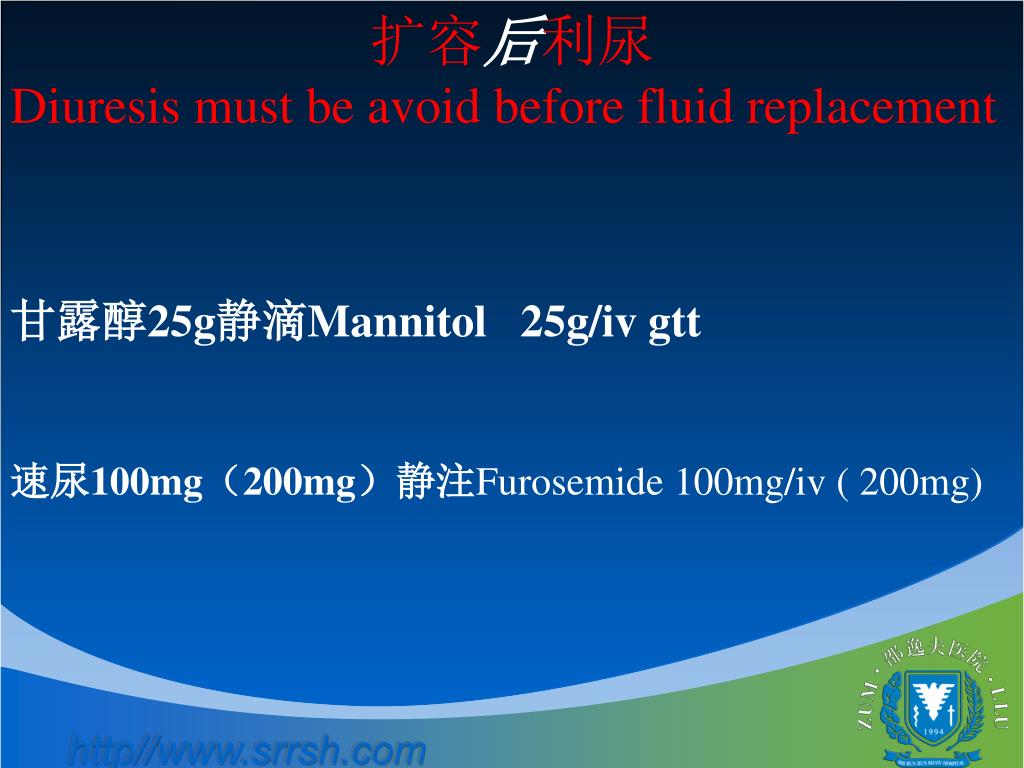 扩容后利尿 Diuresis must be avoid before fluid replacement 甘露醇25g静滴Mannitol 25g/iv gtt 速尿100mg(200mg)静注Furosemide 100mg/iv ( 200mg)