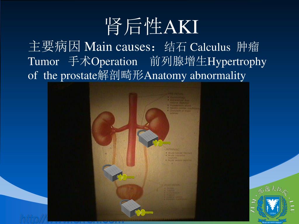 肾后性AKI 主要病因 Main causes:结石 Calculus 肿瘤Tumor 手术Operation 前列腺增生Hypertrophy of the prostate解剖畸形Anatomy abnormality