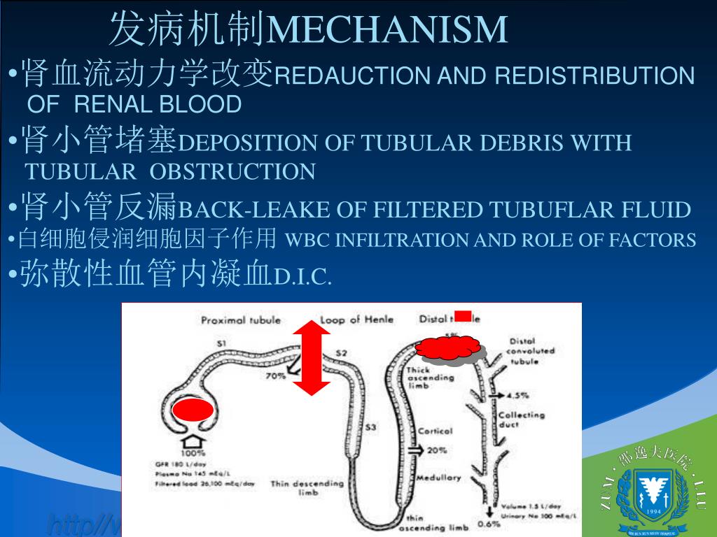 发病机制MECHANISM • 肾血流动力学改变REDAUCTION AND REDISTRIBUTION • OF RENAL BLOOD • 肾小管堵塞DEPOSITION OF TUBULAR DEBRIS WITH • TUBULAR OBSTRUCTION • 肾小管反漏BACK-LEAKE OF FILTERED TUBUFLAR FLUID • 白细胞侵润细胞因子作用 WBC INFILTRATION AND ROLE OF FACTORS • 弥散性血管内凝血D.I.C.