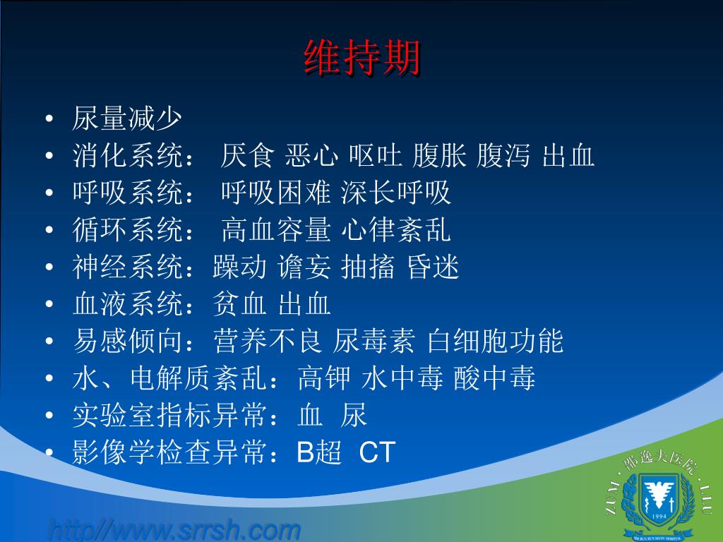 维持期 • 尿量减少 • 消化系统: 厌食 恶心 呕吐 腹胀 腹泻 出血 • 呼吸系统: 呼吸困难 深长呼吸 • 循环系统: 高血容量 心律紊乱 • 神经系统:躁动 谵妄 抽搐 昏迷 • 血液系统:贫血 出血 • 易感倾向:营养不良 尿毒素 白细胞功能 • 水、电解质紊乱:高钾 水中毒 酸中毒 • 实验室指标异常:血 尿 • 影像学检查异常:B超 CT