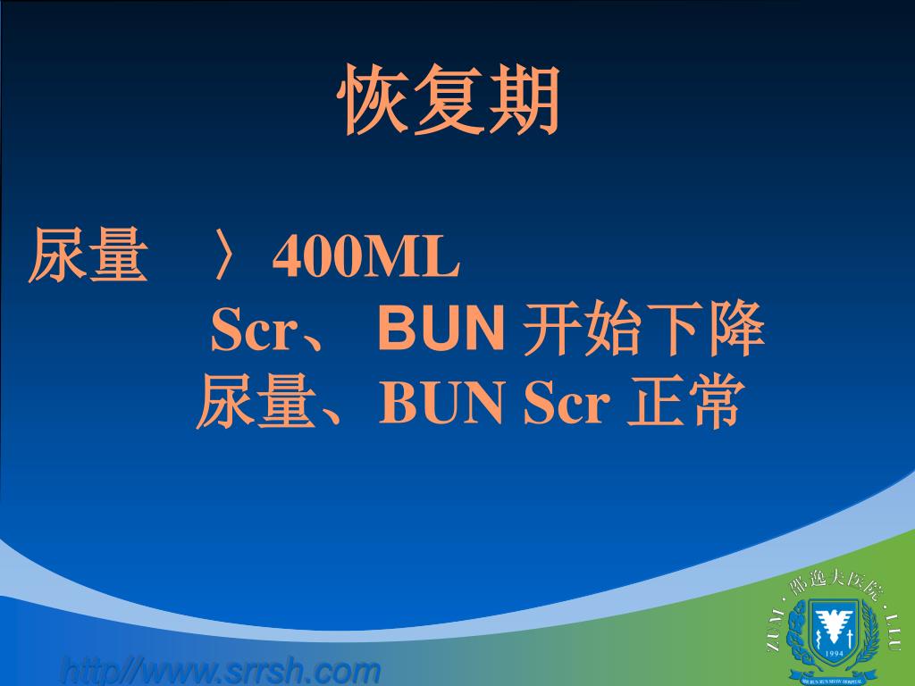恢复期 尿量 〉400ML Scr、 BUN 开始下降 尿量、BUN Scr 正常