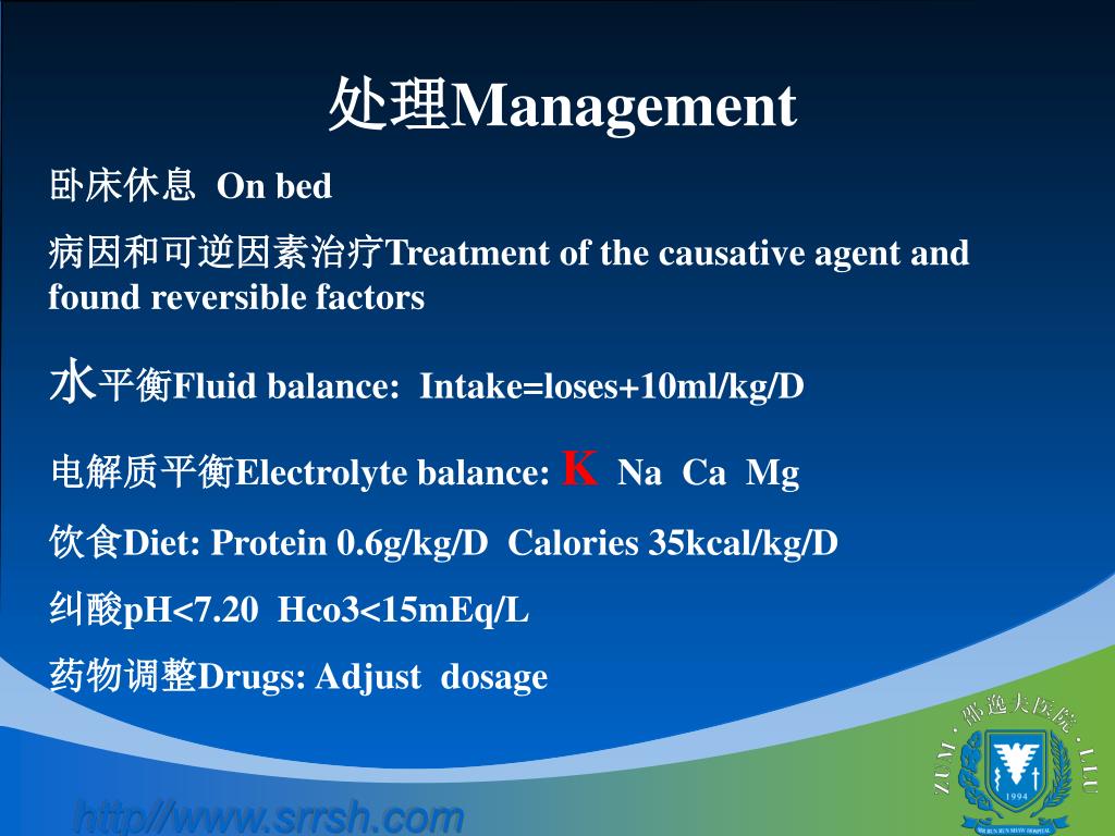 处理Management 卧床休息 On bed 病因和可逆因素治疗Treatment of the causative agent and found reversible factors 水平衡Fluid balance: Intake=loses+10ml/kg/D 电解质平衡Electrolyte balance: K Na Ca Mg 饮食Diet: Protein 0.6g/kg/D Calories 35kcal/kg/D 纠酸pH<7.20 Hco3<15mEq/L 药物调整Drugs: Adjust dosage