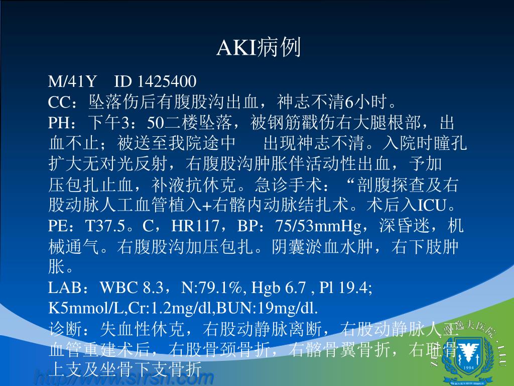 AKI病例 M/41Y ID 1425400 CC:坠落伤后有腹股沟出血,神志不清6小时。 PH:下午3:50二楼坠落,被钢筋戳伤右大腿根部,出血不止;被送至我院途中 出现神志不清。入院时瞳孔扩大无对光反射,右腹股沟肿胀伴活动性出血,予加 压包扎止血,补液抗休克。急诊手术:“剖腹探查及右股动脉人工血管植入+右髂内动脉结扎术。术后入ICU。PE:T37.5。C,HR117,BP:75/53mmHg,深昏迷,机械通气。右腹股沟加压包扎。阴囊淤血水肿,右下肢肿胀。 LAB:WBC 8.3,N:79.1%, Hgb 6.7 , Pl 19.4; K5mmol/L,Cr:1.2mg/dl,BUN:19mg/dl. 诊断:失血性休克,右股动静脉离断,右股动静脉人工血管重建术后,右股骨颈骨折,右髂骨翼骨折,右耻骨上支及坐骨下支骨折