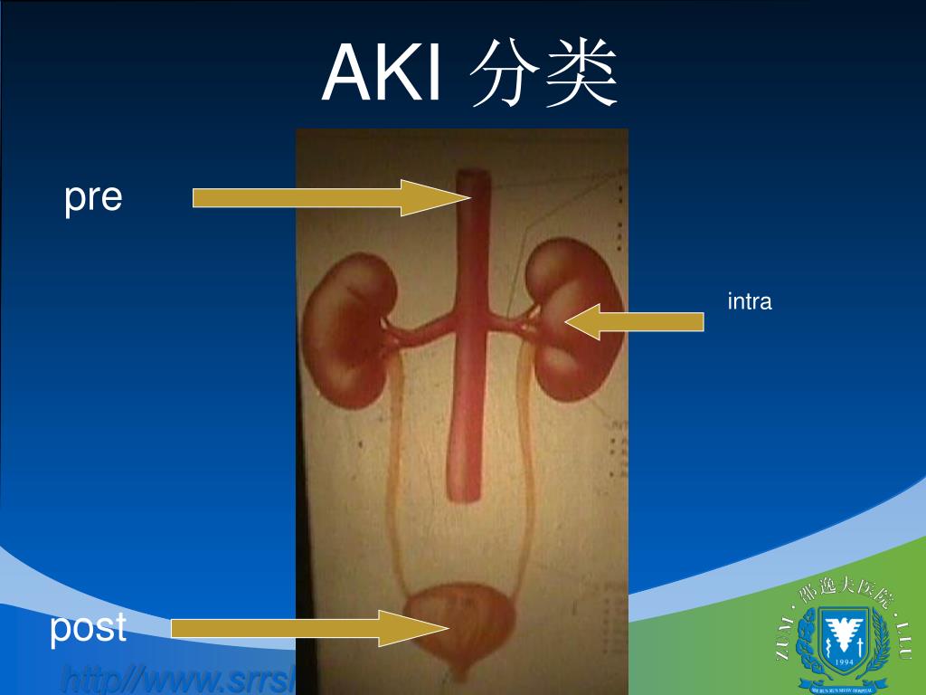 急性肾损伤 Acute Kidney Injury (AKI). 浙江大学邵逸夫医院肾脏科 叶有新. 浙江大学附属邵逸夫医院肾脏科 叶有新. 肾 脏 解 剖 Anatomy of the Kidney. 正常肾脏功能 Renal function. 排除毒素 Excretion of toxin 维持机体水、电解质和酸碱平衡 Maintaining water,electrolytes and acid-base balance 内分泌 Endocrine. AKI 分类. pre. intra. post.