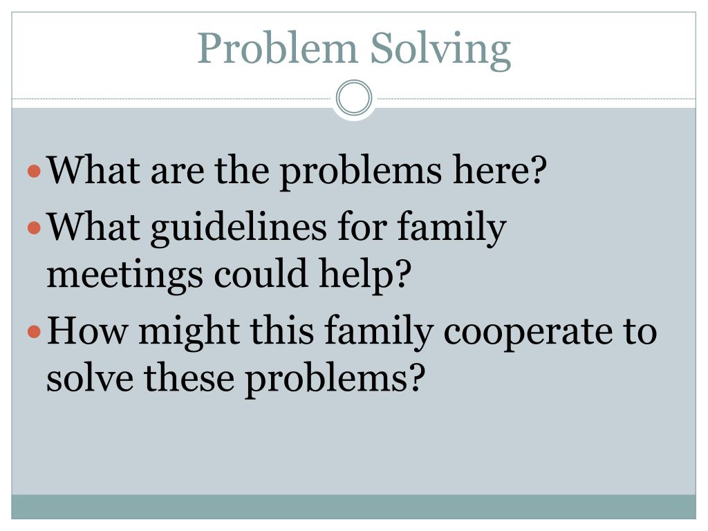 Problem Solving • What are the problems here? • What guidelines for family meetings could help? • How might this family cooperate to solve these problems?