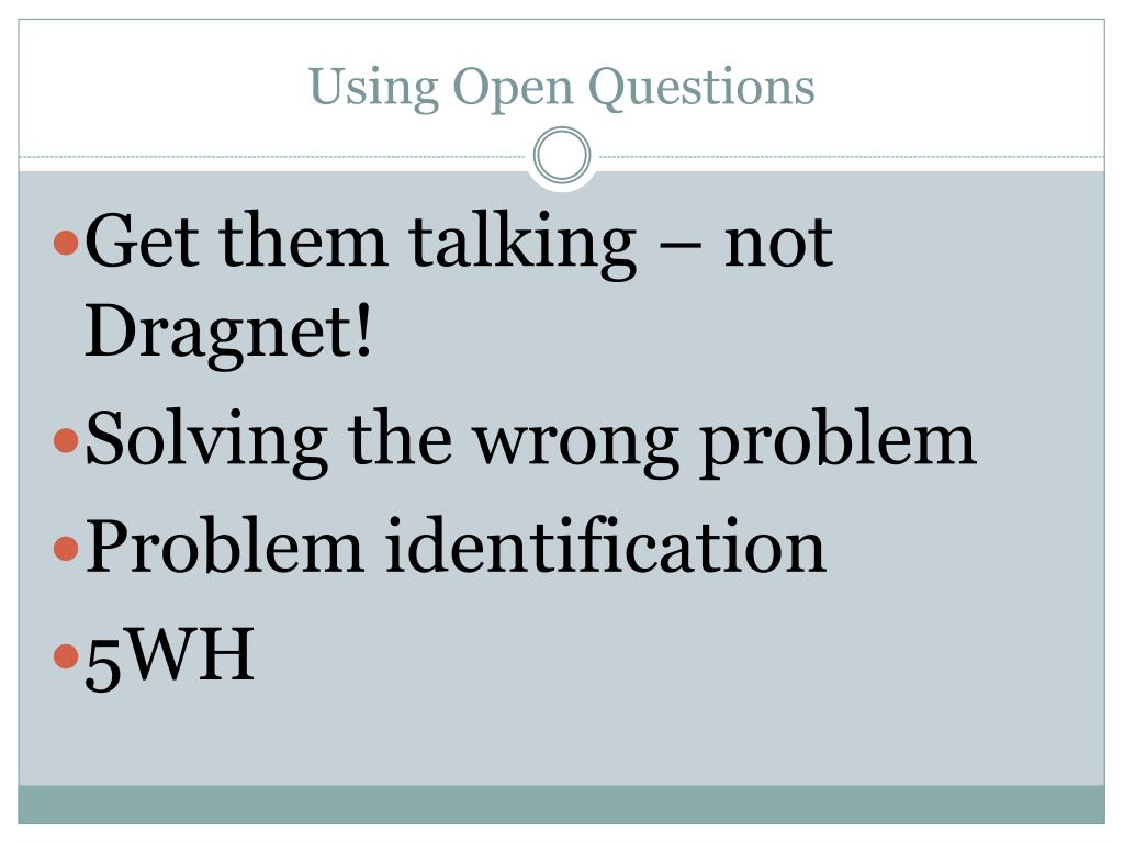 Using Open Questions Get them talking – not Dragnet! Solving the wrong problem Problem identification 5WH