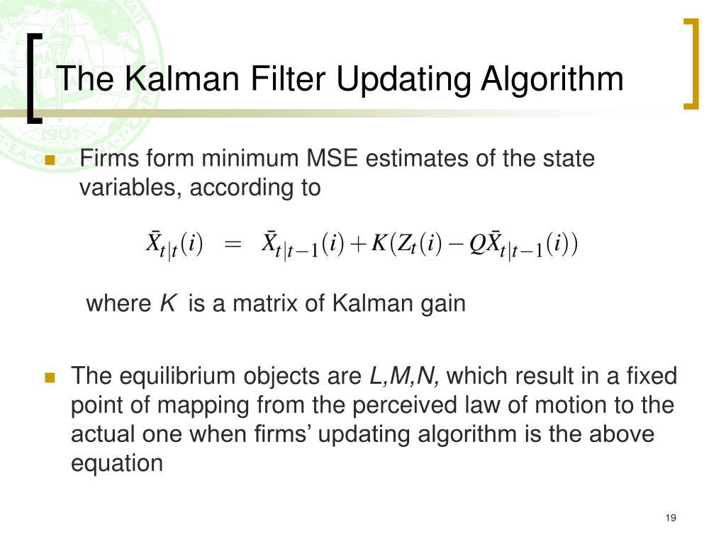 The Kalman Filter Updating Algorithm • Firms form minimum MSE estimates of the state variables, according to where K is a matrix of Kalman gain • The equilibrium objects are L,M,N, which result in a fixed point of mapping from the perceived law of motion to the actual one when firms’ updating algorithm is the above equation
