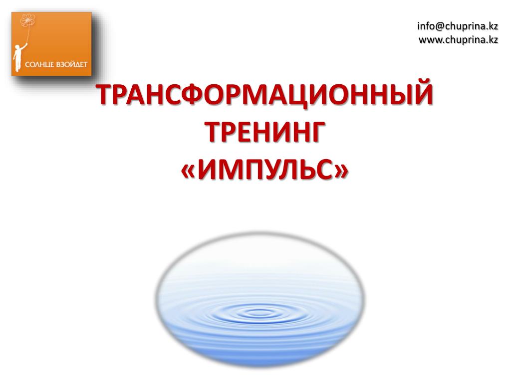 info@chuprina.kz www.chuprina.kz Импульс- (impulsus) — толчок, побуждение. ТРАНСФОРМАЦИОННЫЙ ТРЕНИНГ : ИМПУЛЬС