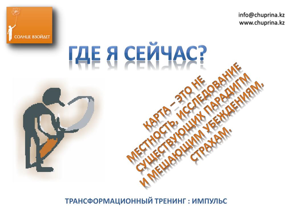 info@chuprina.kz www.chuprina.kz ГДЕ Я СЕЙЧАС? Карта – это не Местность, ИССЛЕДОВАНИЕ СУЩЕСТВУЮЩИХ ПАРАДИГМ И МЕШАЮЩИМ УБЕЖДЕНИЯМ, СТРАХАМ. ТРАНСФОРМАЦИОННЫЙ ТРЕНИНГ : ИМПУЛЬС