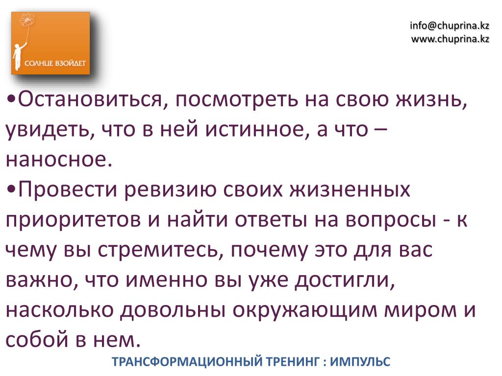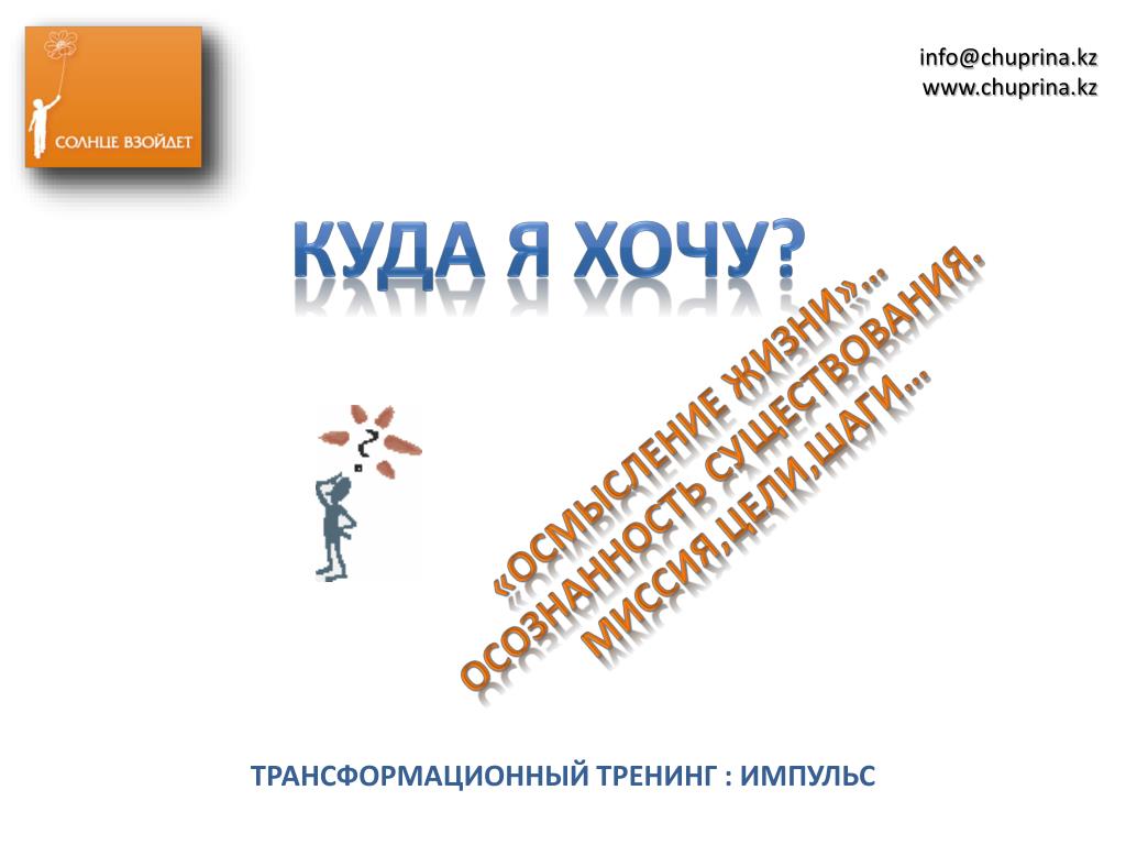 info@chuprina.kz www.chuprina.kz Куда я хочу? «ОСМЫСЛЕНИЕ ЖИЗНИ»… ОСОЗНАННОСТЬ СУЩЕСТВОВАНИЯ. МИССИЯ,ЦЕЛИ,ШАГИ… ТРАНСФОРМАЦИОННЫЙ ТРЕНИНГ : ИМПУЛЬС