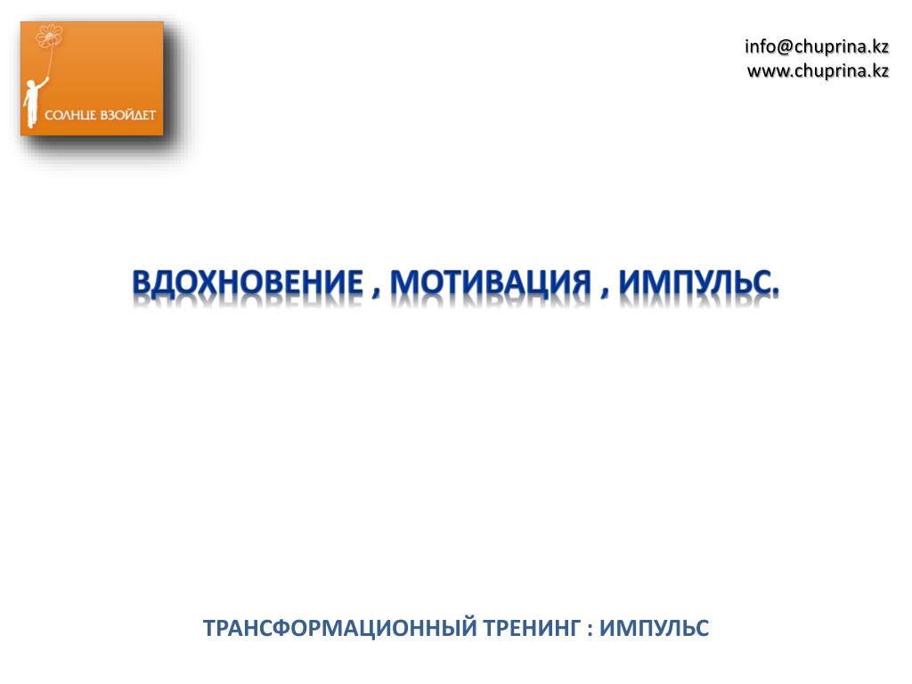 info@chuprina.kz www.chuprina.kz ВДОХНОВЕНИЕ , МОТИВАЦИЯ , ИМПУЛЬС. ТРАНСФОРМАЦИОННЫЙ ТРЕНИНГ : ИМПУЛЬС