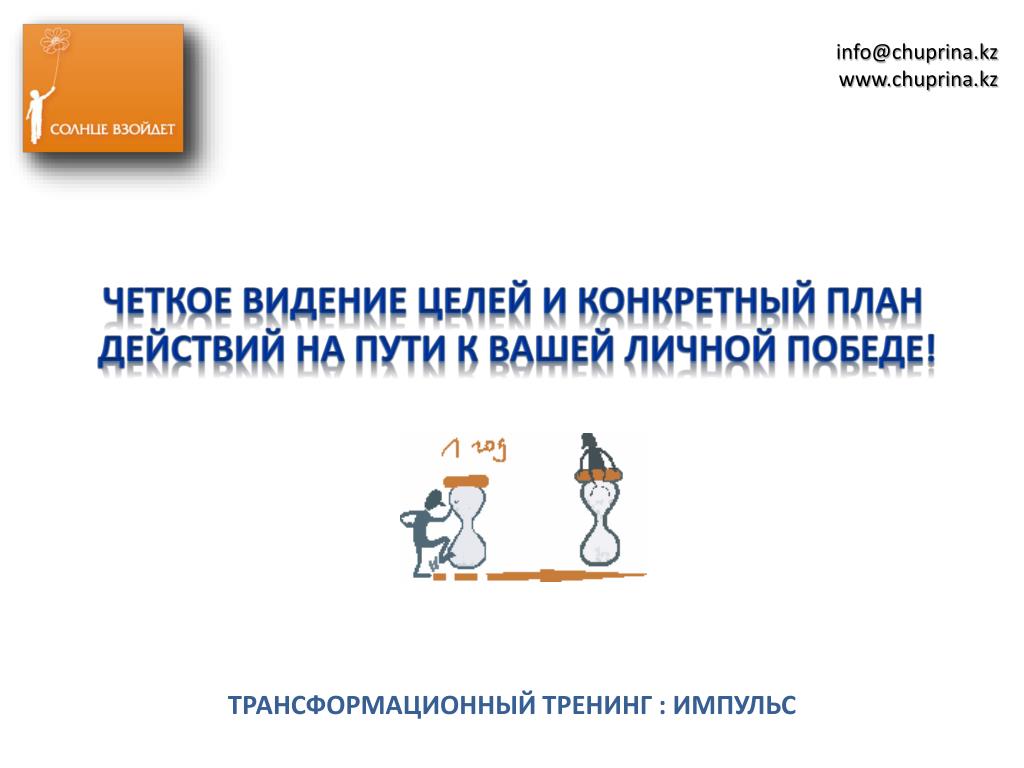 info@chuprina.kz www.chuprina.kz Четкое видение целей и конкретный план действий на пути к вашей личной победе! ТРАНСФОРМАЦИОННЫЙ ТРЕНИНГ : ИМПУЛЬС