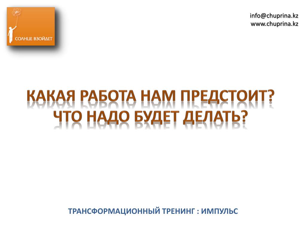 info@chuprina.kz www.chuprina.kz Какая работа нам предстоит? Что надо будет делать? ТРАНСФОРМАЦИОННЫЙ ТРЕНИНГ : ИМПУЛЬС
