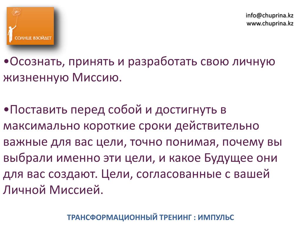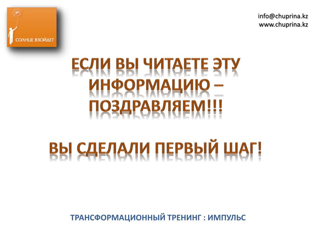 info@chuprina.kz www.chuprina.kz Если вы читаете эту информацию – Поздравляем!!! Вы сделали первый шаг! ТРАНСФОРМАЦИОННЫЙ ТРЕНИНГ : ИМПУЛЬС
