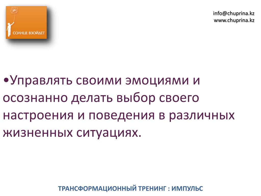 info@chuprina.kz www.chuprina.kz • Управлять своими эмоциями и осознанно делать выбор своего настроения и поведения в различных жизненных ситуациях. ТРАНСФОРМАЦИОННЫЙ ТРЕНИНГ : ИМПУЛЬС