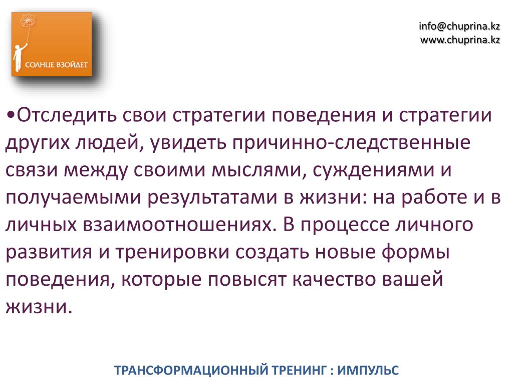 info@chuprina.kz www.chuprina.kz Этот тренинг в большей степени ориентирован на самопознание участников с точки зрения отслеживания и осознания своих стратегий, убеждений, эмоциональных состояний и их взаимосвязи с получаемыми результатами на работе, в семье и других областях жизни. ТРАНСФОРМАЦИОННЫЙ ТРЕНИНГ : ИМПУЛЬС
