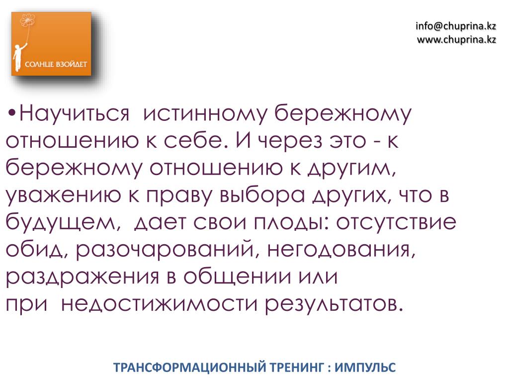 info@chuprina.kz www.chuprina.kz • Научиться истинному бережному отношению к себе. И через это - к бережному отношению к другим, уважению к праву выбора других, что в будущем, дает свои плоды: отсутствие обид, разочарований, негодования, раздражения в общении или при недостижимости результатов. ТРАНСФОРМАЦИОННЫЙ ТРЕНИНГ : ИМПУЛЬС