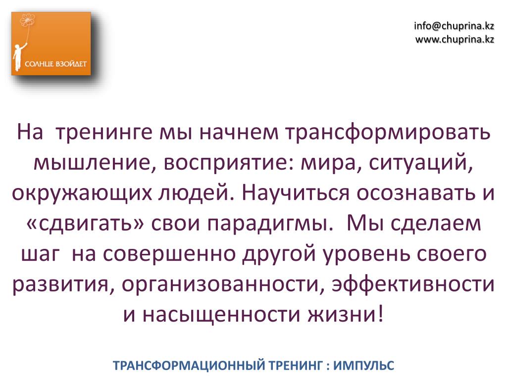 info@chuprina.kz www.chuprina.kz На тренинге мы начнем трансформировать мышление, восприятие: мира, ситуаций, окружающих людей. Научиться осознавать и «сдвигать» свои парадигмы. Мы сделаем шаг на совершенно другой уровень своего развития, организованности, эффективности и насыщенности жизни! ТРАНСФОРМАЦИОННЫЙ ТРЕНИНГ : ИМПУЛЬС