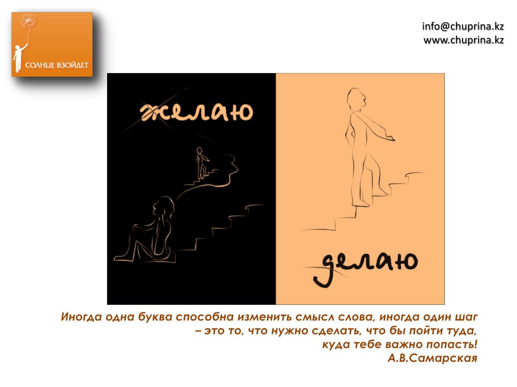 info@chuprina.kz www.chuprina.kz Иногда одна буква способна изменить смысл слова, иногда один шаг – это то, что нужно сделать, что бы пойти туда, куда тебе важно попасть! А.В.Самарская