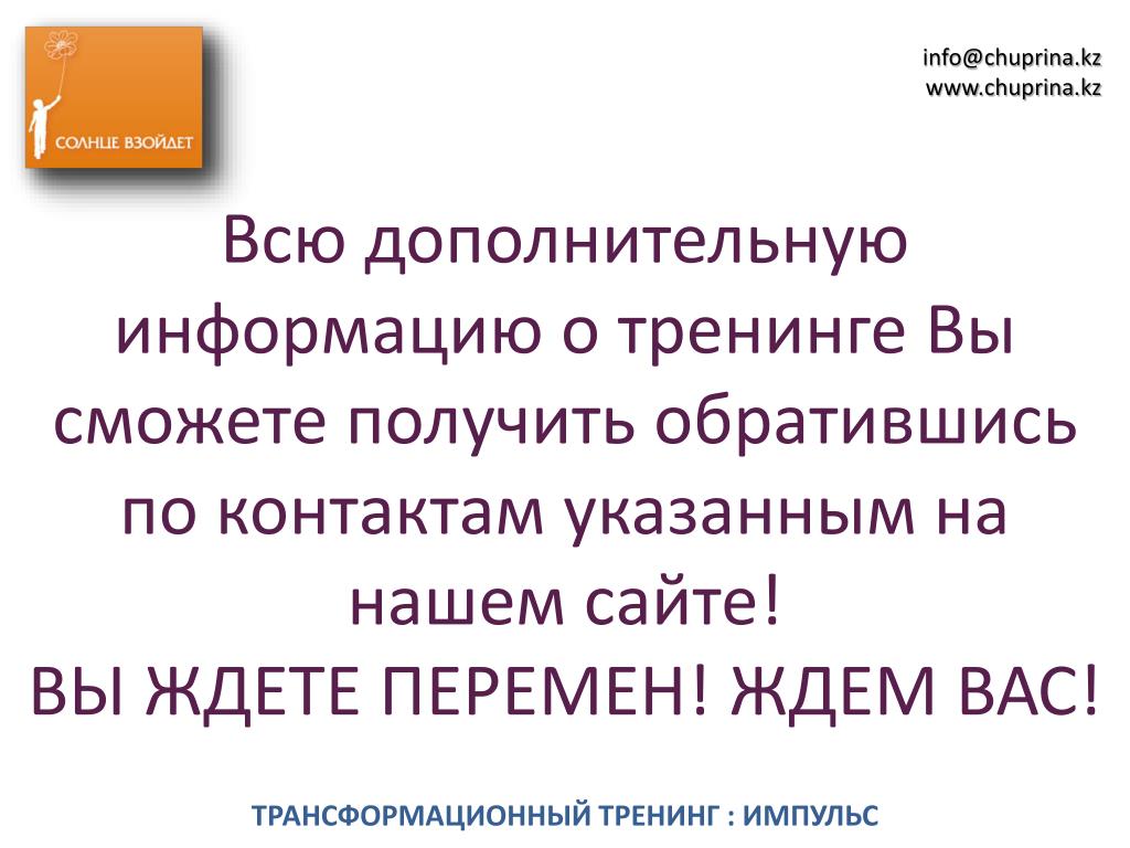 info@chuprina.kz www.chuprina.kz Всю дополнительную информацию о тренинге Вы сможете получить обратившись по контактам указанным на нашем сайте! ВЫ ЖДЕТЕ ПЕРЕМЕН! ЖДЕМ ВАС! ТРАНСФОРМАЦИОННЫЙ ТРЕНИНГ : ИМПУЛЬС