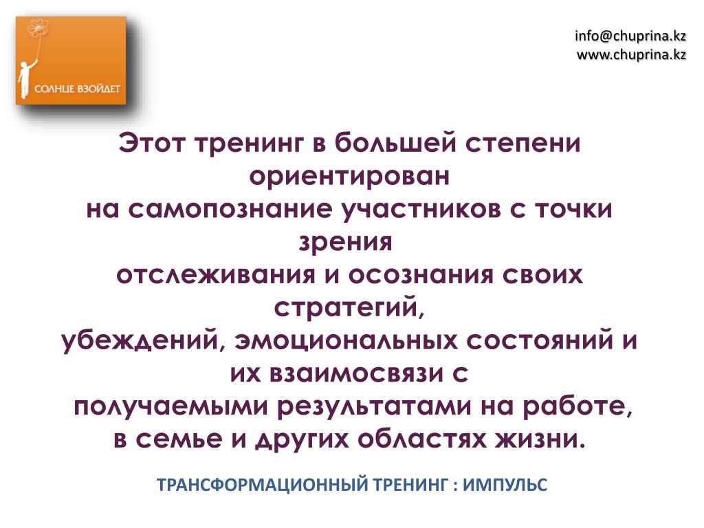 info@chuprina.kz www.chuprina.kz ТРАНСФОРМАЦИОННЫЙ ТРЕНИНГ «ИМПУЛЬС»