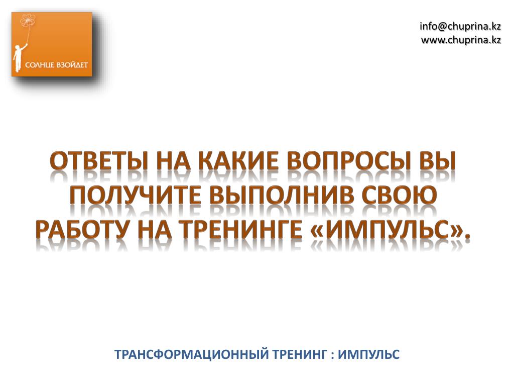 info@chuprina.kz www.chuprina.kz ОТВЕТЫ НА КАКИЕ ВОПРОСЫ ВЫ ПОЛУЧИТЕ ВЫПОЛНИВ СВОЮ РАБОТУ НА ТРЕНИНГЕ «ИМПУЛЬС». ТРАНСФОРМАЦИОННЫЙ ТРЕНИНГ : ИМПУЛЬС