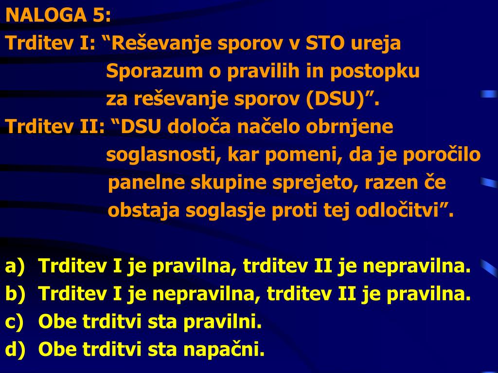 NALOGA 5: Trditev I: “Reševanje sporov v STO ureja Sporazum o pravilih in postopku za reševanje sporov (DSU)”. Trditev II: “DSU določa načelo obrnjene soglasnosti, kar pomeni, da je poročilo panelne skupine sprejeto, razen če obstaja soglasje proti tej odločitvi”. • Trditev I je pravilna, trditev II je nepravilna. • Trditev I je nepravilna, trditev II je pravilna. • Obe trditvi sta pravilni. • Obe trditvi sta napačni.