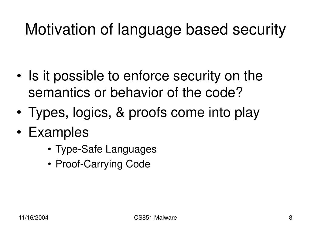 Motivation of language based security • Is it possible to enforce security on the semantics or behavior of the code? • Types, logics, & proofs come into play • Examples • Type-Safe Languages • Proof-Carrying Code CS851 Malware