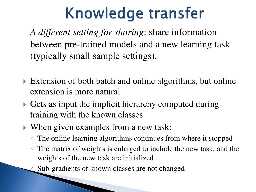 Knowledge transfer A different setting for sharing: share information between pre-trained models and a new learning task (typically small sample settings). • Extension of both batch and online algorithms, but online extension is more natural • Gets as input the implicit hierarchy computed during training with the known classes • When given examples from a new task: • The online learning algorithms continues from where it stopped • The matrix of weights is enlarged to include the new task, and the weights of the new task are initialized • Sub-gradients of known classes are not changed