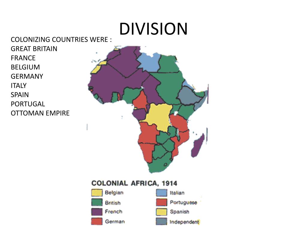 DIVISION COLONIZING COUNTRIES WERE : GREAT BRITAIN FRANCE BELGIUM GERMANY ITALY SPAIN PORTUGAL OTTOMAN EMPIRE