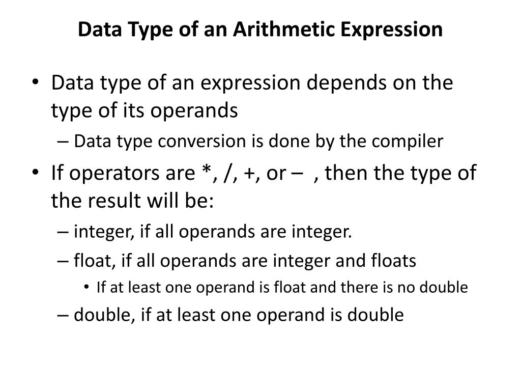 Data Type of an Arithmetic Expression • Data type of an expression depends on the type of its operands • Data type conversion is done by the compiler • If operators are *, /, +, or – , then the type of the result will be: • integer, if all operands are integer. • float, if all operands are integer and floats • If at least one operand is float and there is no double • double, if at least one operand is double