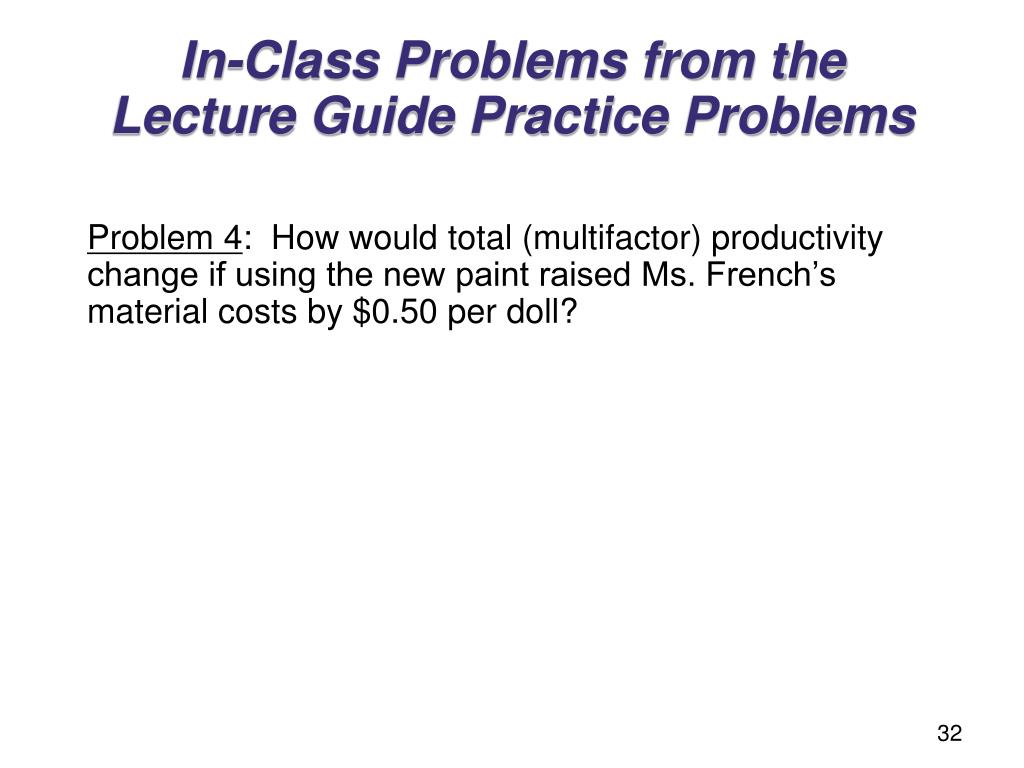 In-Class Problems from the Lecture Guide Practice Problems Problem 4: How would total (multifactor) productivity change if using the new paint raised Ms. French’s material costs by $0.50 per doll?