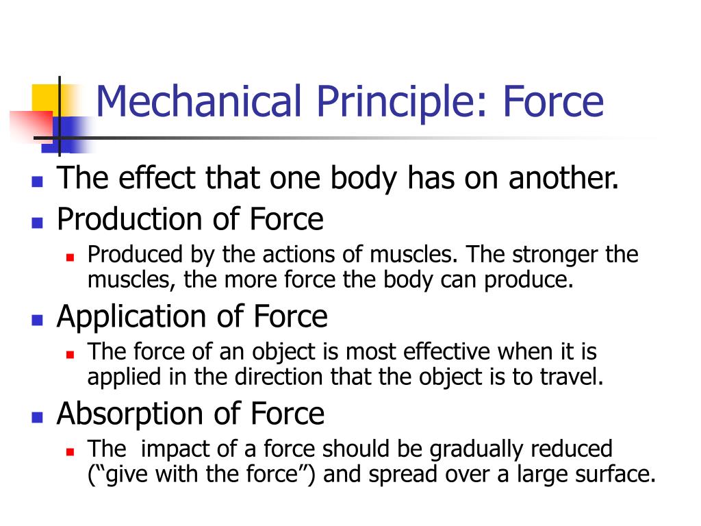Mechanical Principle: Force • The effect that one body has on another. • Production of Force • Produced by the actions of muscles. The stronger the muscles, the more force the body can produce. • Application of Force • The force of an object is most effective when it is applied in the direction that the object is to travel. • Absorption of Force • The impact of a force should be gradually reduced (“give with the force”) and spread over a large surface.