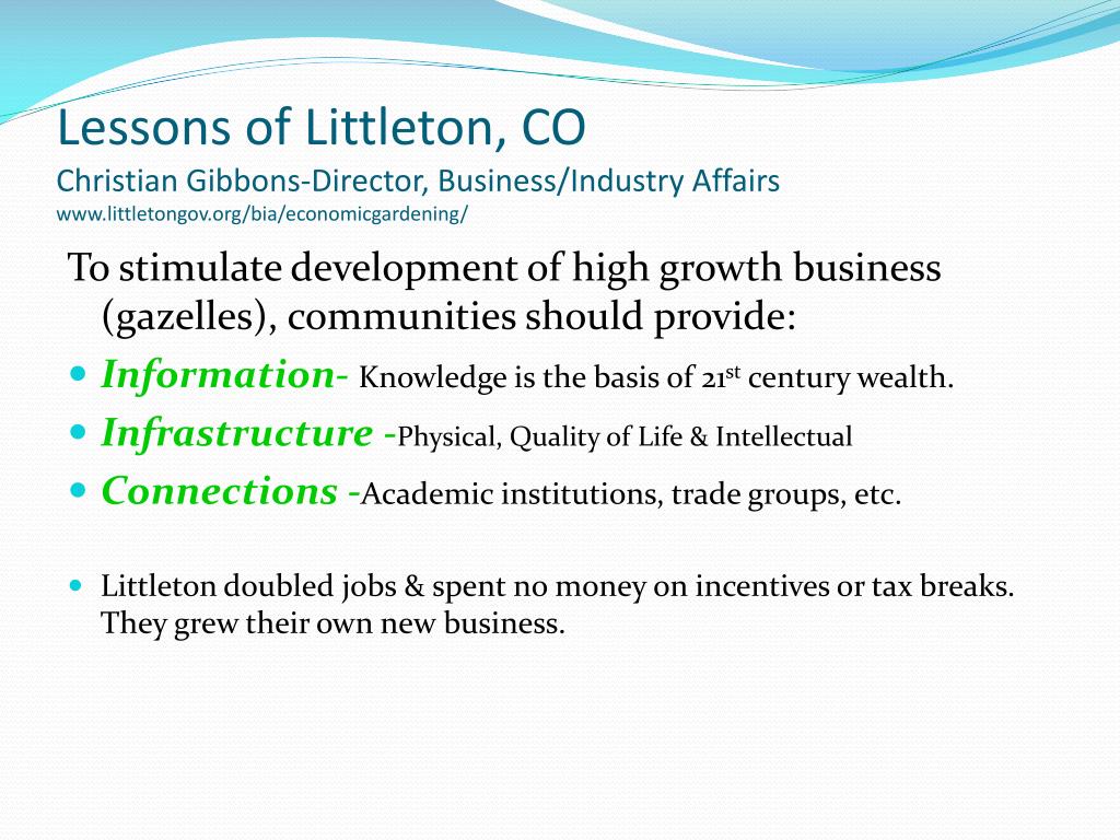Lessons of Littleton, COChristian Gibbons-Director, Business/Industry Affairswww.littletongov.org/bia/economicgardening/ To stimulate development of high growth business (gazelles), communities should provide: • Information- Knowledge is the basis of 21st century wealth. • Infrastructure -Physical, Quality of Life & Intellectual • Connections -Academic institutions, trade groups, etc. • Littleton doubled jobs & spent no money on incentives or tax breaks. They grew their own new business.