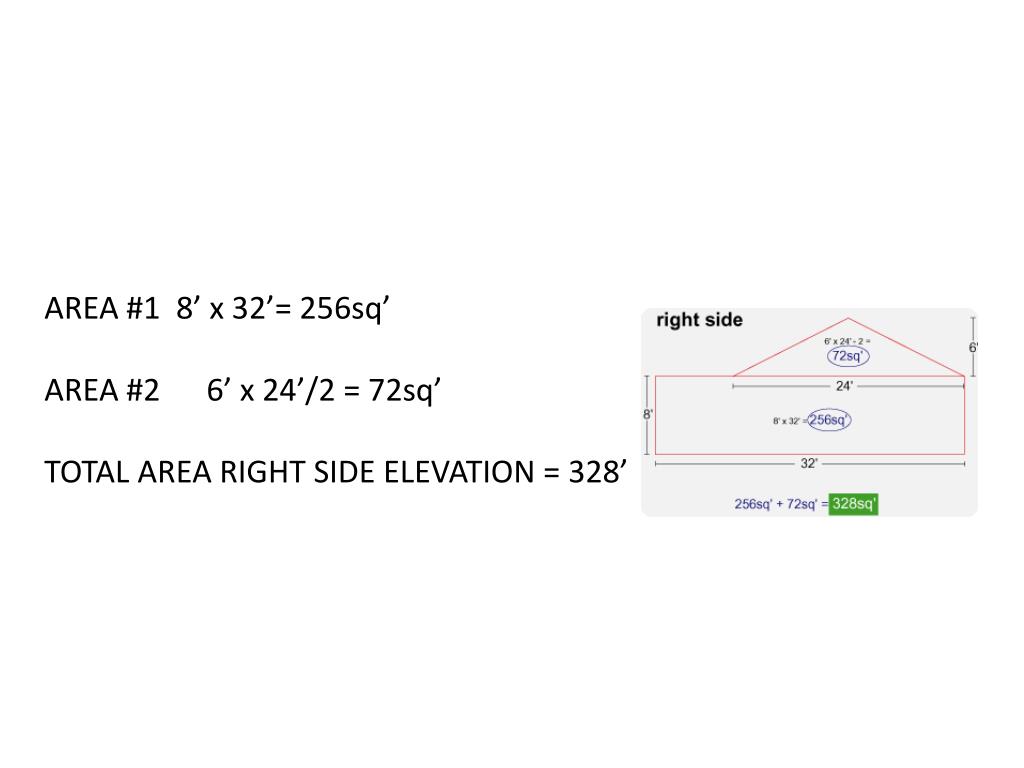 AREA #1 8’ x 32’= 256sq’ AREA #2 6’ x 24’/2 = 72sq’ TOTAL AREA RIGHT SIDE ELEVATION = 328’